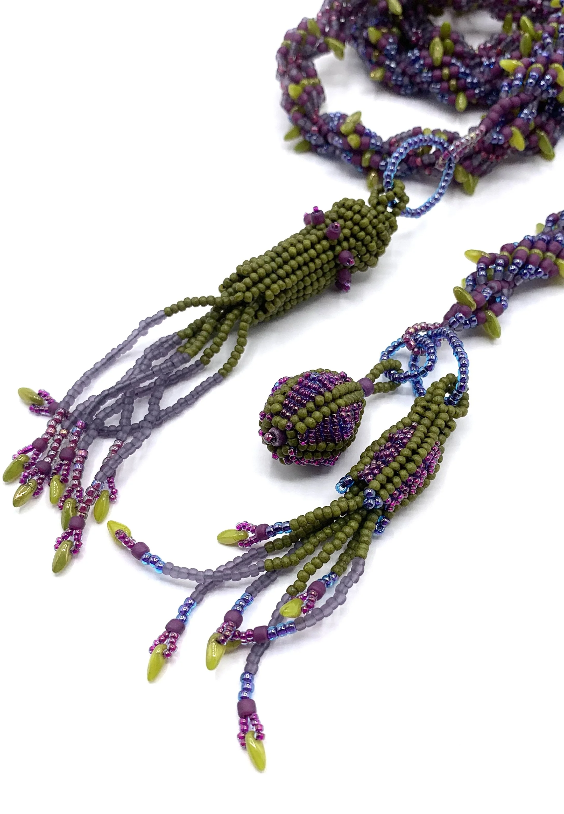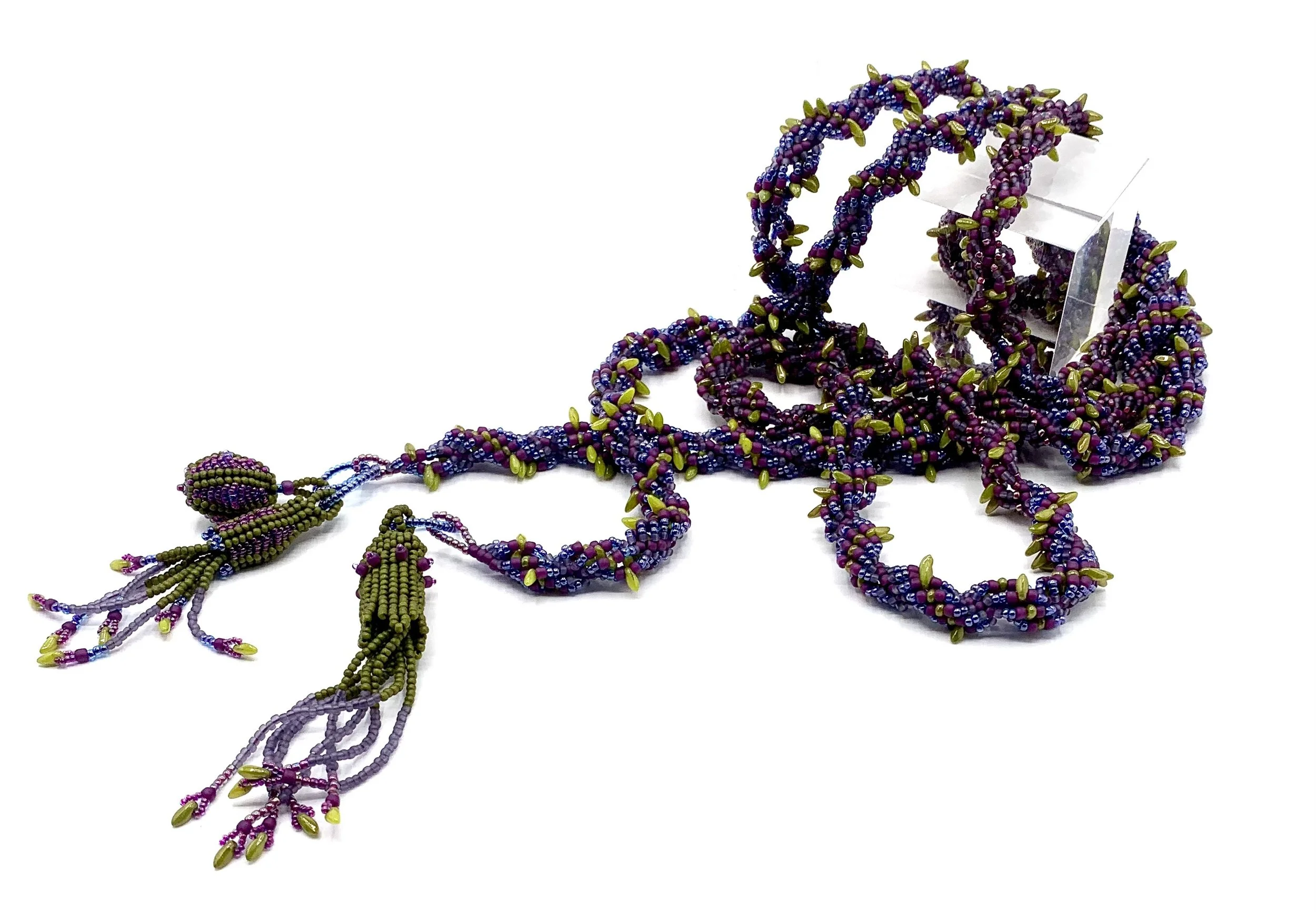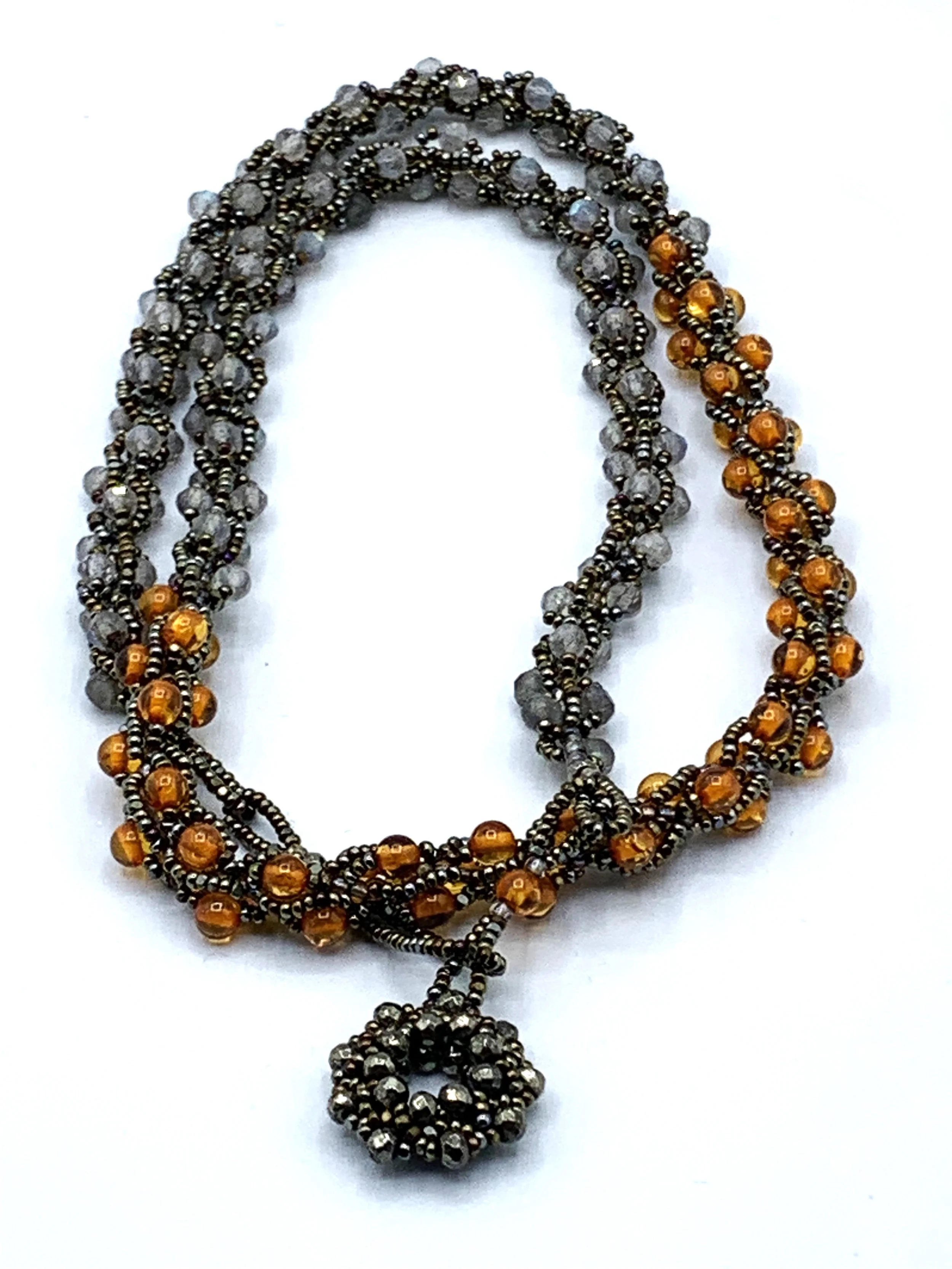 spiral lariats Glass beads and gemstones make up these spiral stitched lariats, each with its one of a kind clasp.